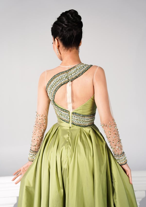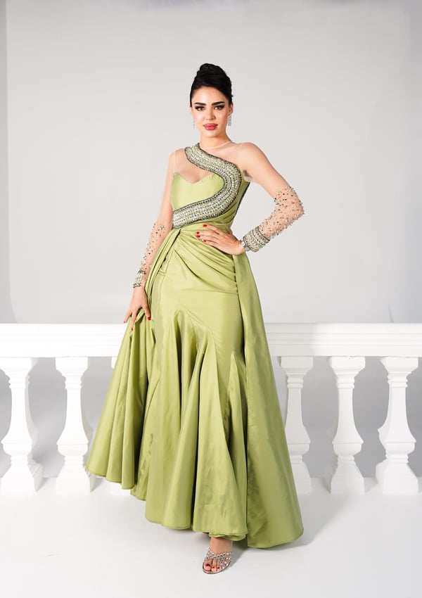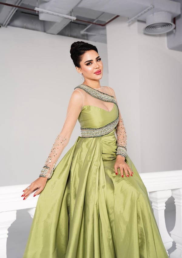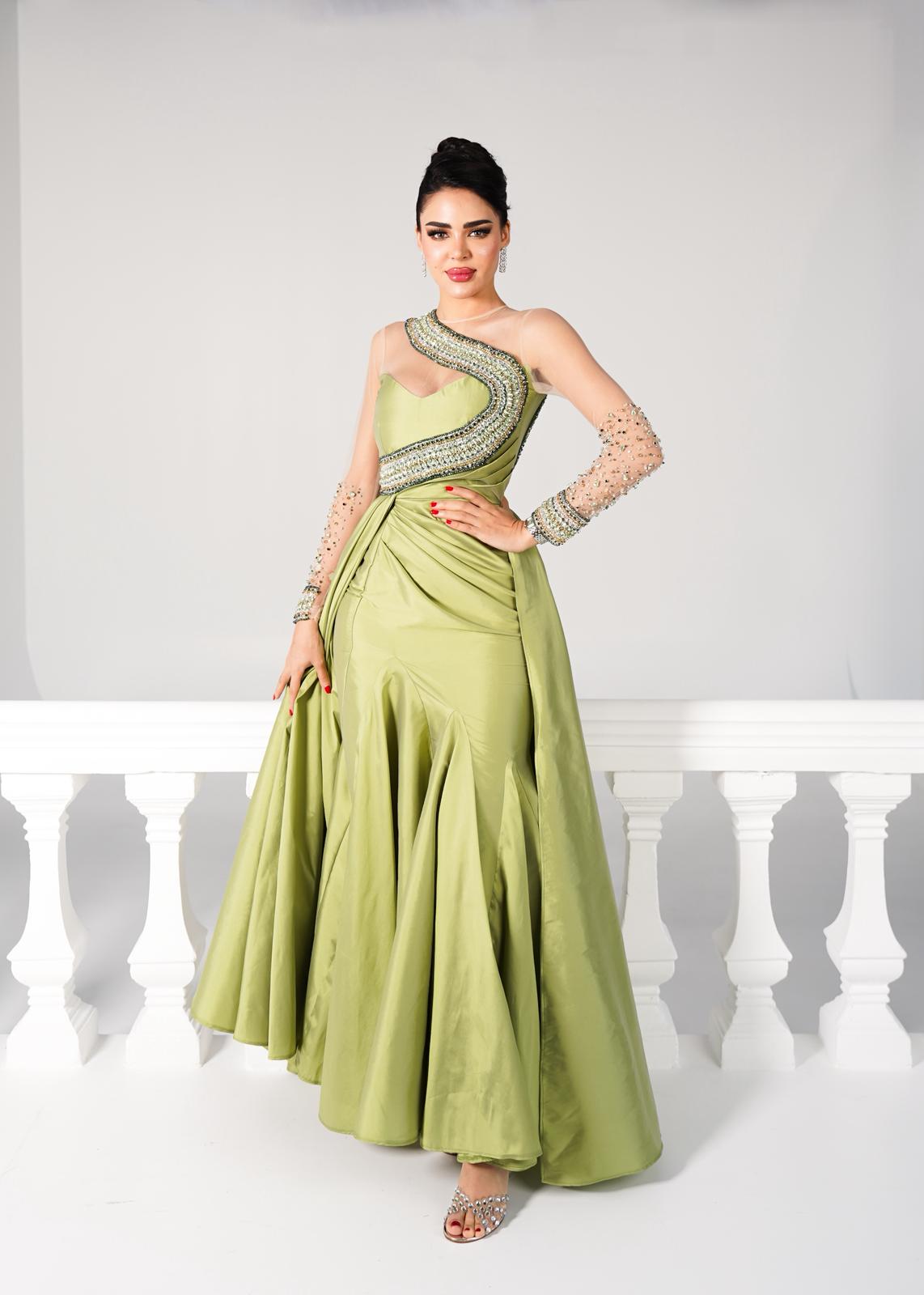 القطعه الجميله بلون الماتشا من قماش التفته الهندي وشك مميز على الاكمام والصدر والظهر